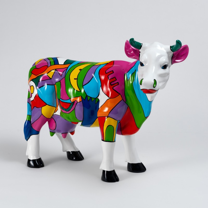 Vache Pop-Art petite taille en résine 45x64cm résistant au gel et à la pluie, est fabriqué en résine polyester avec un laquage et un vernis UV haute résistance. La peinture est automobile de haute qualité avec une finition impeccable. Vous pouvez choisir les couleurs , chaque statue est personnalisable . N'hésitez pas de demander le devis.